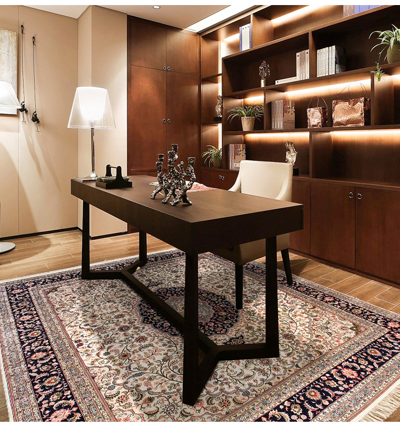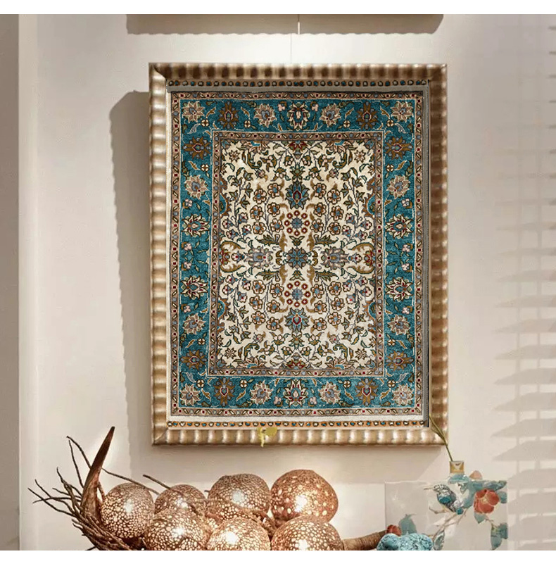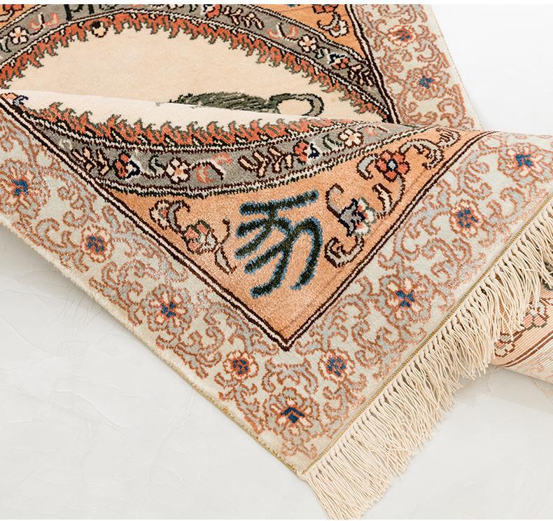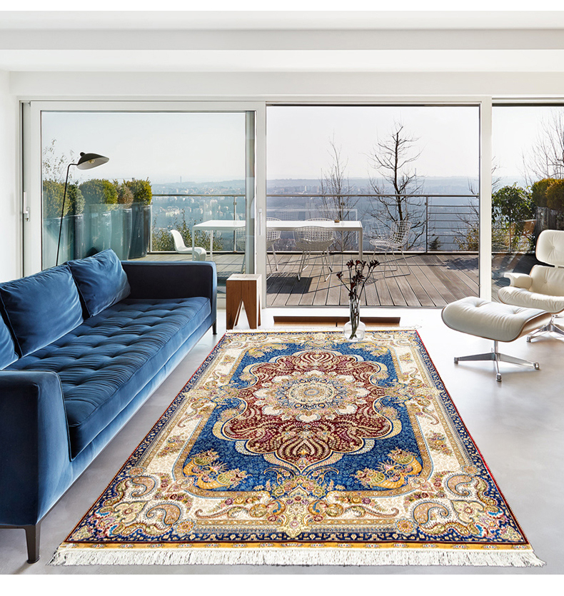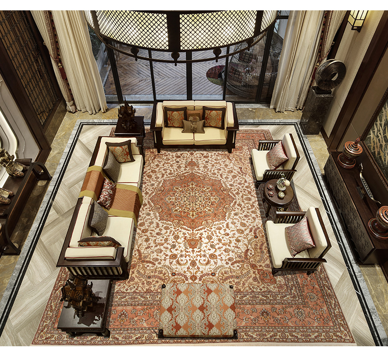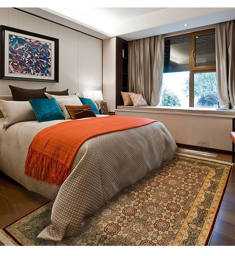 真絲指蠶絲,也是地毯的傳統材料之一,使用歷史非常悠久,我國唐代詩人白居易曾有"一丈毯,千兩絲"的詩句。 真絲地毯指的就是絲毯,即以桑蠶絲線、柞蠶絲線栽絨綰結而編織成的手工栽絨地毯。真絲地毯花紋精致細膩,質感很強,深受各界人士喜愛。其圖案靈活多變,多采用中國的傳統紋飾,花紋精 致,有良好寓意。 絲毯的生產工藝與羊毛地毯大致相同,僅是原料準備和后處理不同。蠶絲先要經過煉絲,即將生絲浸在堿溶液中,去除絲纖維外表的膠質,成為熟絲。一般將27根熟絲捻成一股絲線,經過酸性染料染色,成為栽絨原料。絲毯的中檔產品采