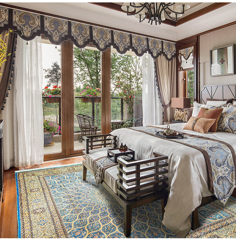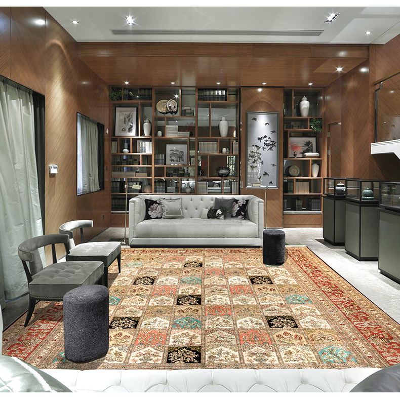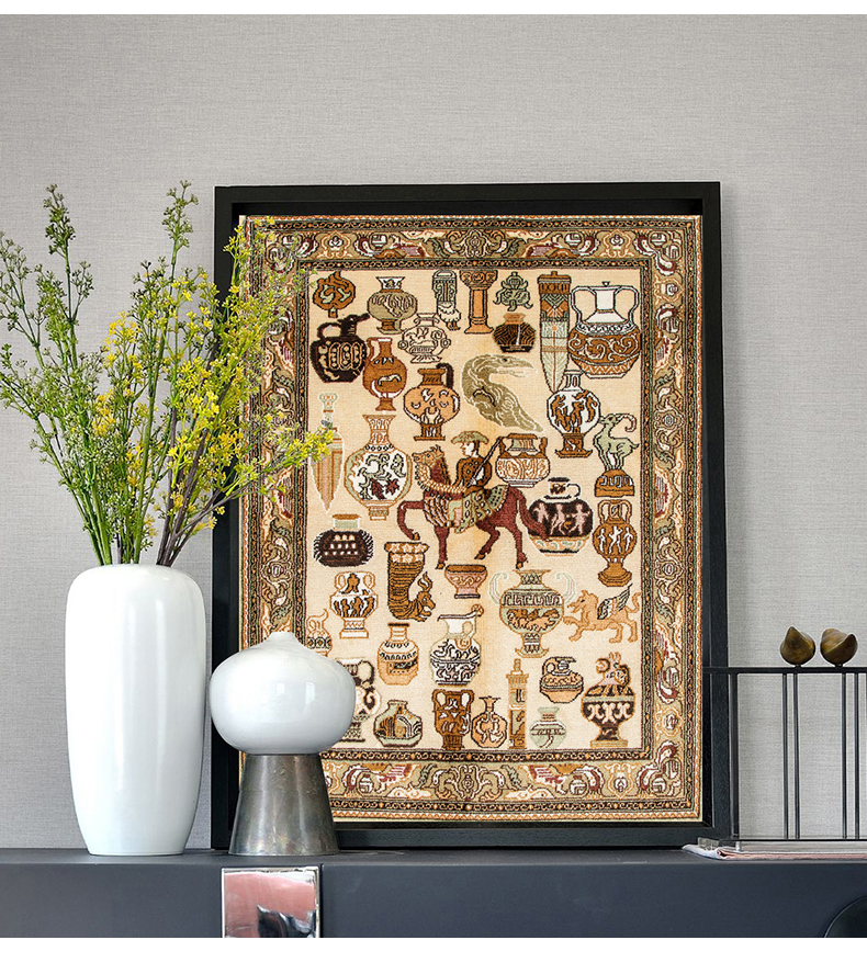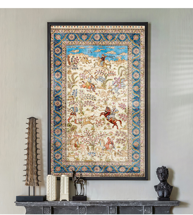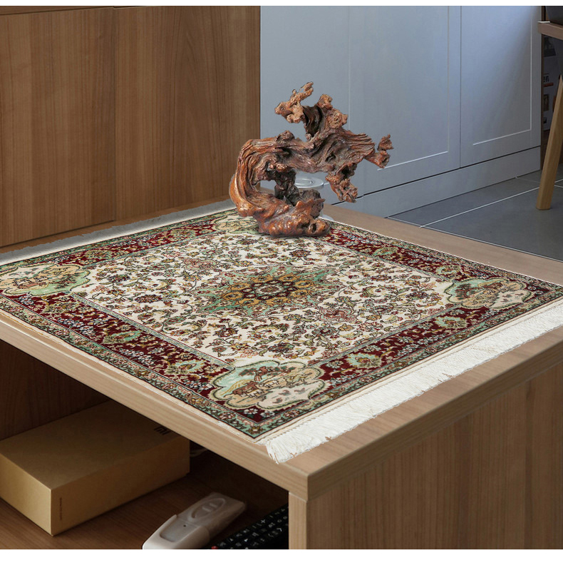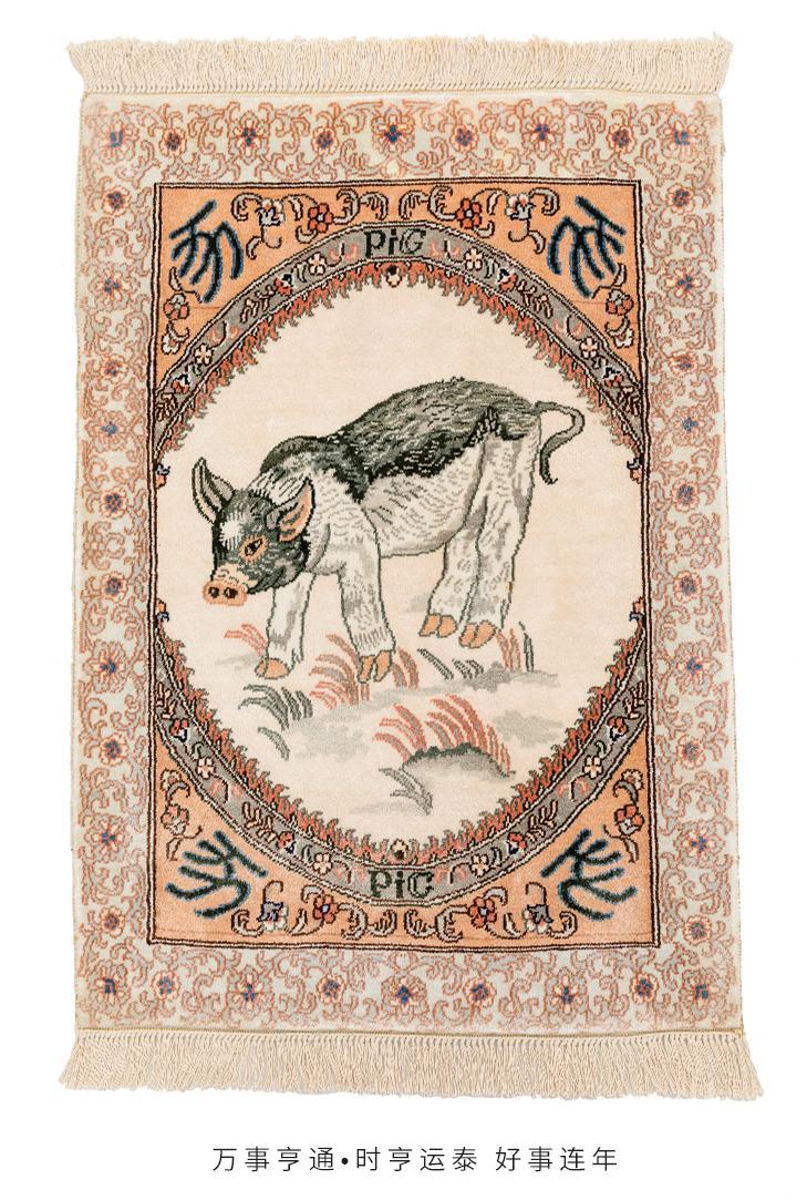 真絲指蠶絲,也是地毯的傳統材料之一,使用歷史非常悠久,我國唐代詩人白居易曾有"一丈毯,千兩絲"的詩句。 真絲地毯指的就是絲毯,即以桑蠶絲線、柞蠶絲線栽絨綰結而編織成的手工栽絨地毯。真絲地毯花紋精致細膩,質感很強,深受各界人士喜愛。其圖案靈活多變,多采用中國的傳統紋飾,花紋精 致,有良好寓意。 絲毯的生產工藝與羊毛地毯大致相同,僅是原料準備和后處理不同。蠶絲先要經過煉絲,即將生絲浸在堿溶液中,去除絲纖維外表的膠質,成為熟絲。一般將27根熟絲捻成一股絲線,經過酸性染料染色,成為栽絨原料。絲毯的中檔產品采